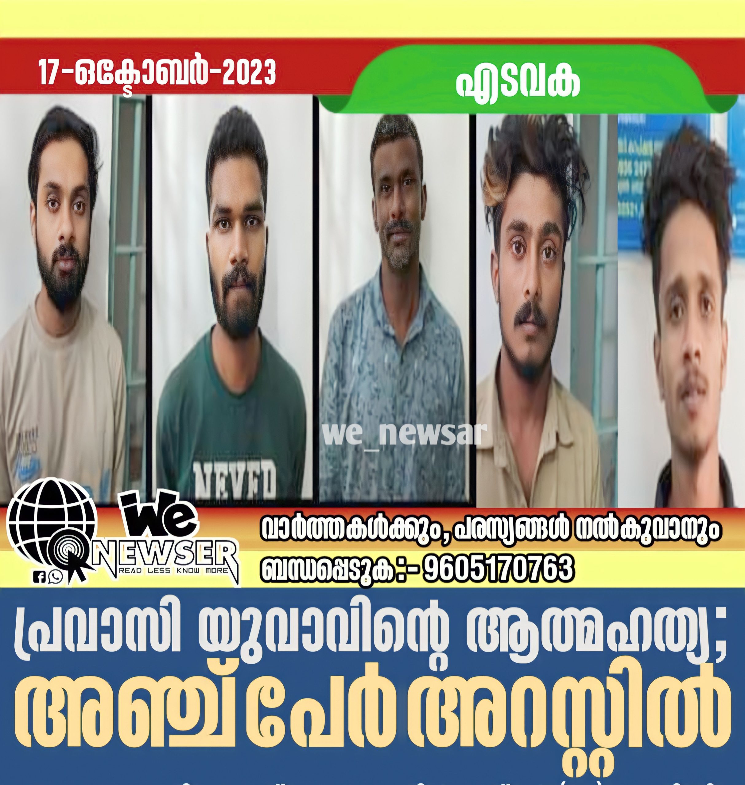 പ്രവാസി യുവാവിന്റെ ആത്മഹത്യ; അഞ്ച് പേർ അറസ്റ്റിൽ.
