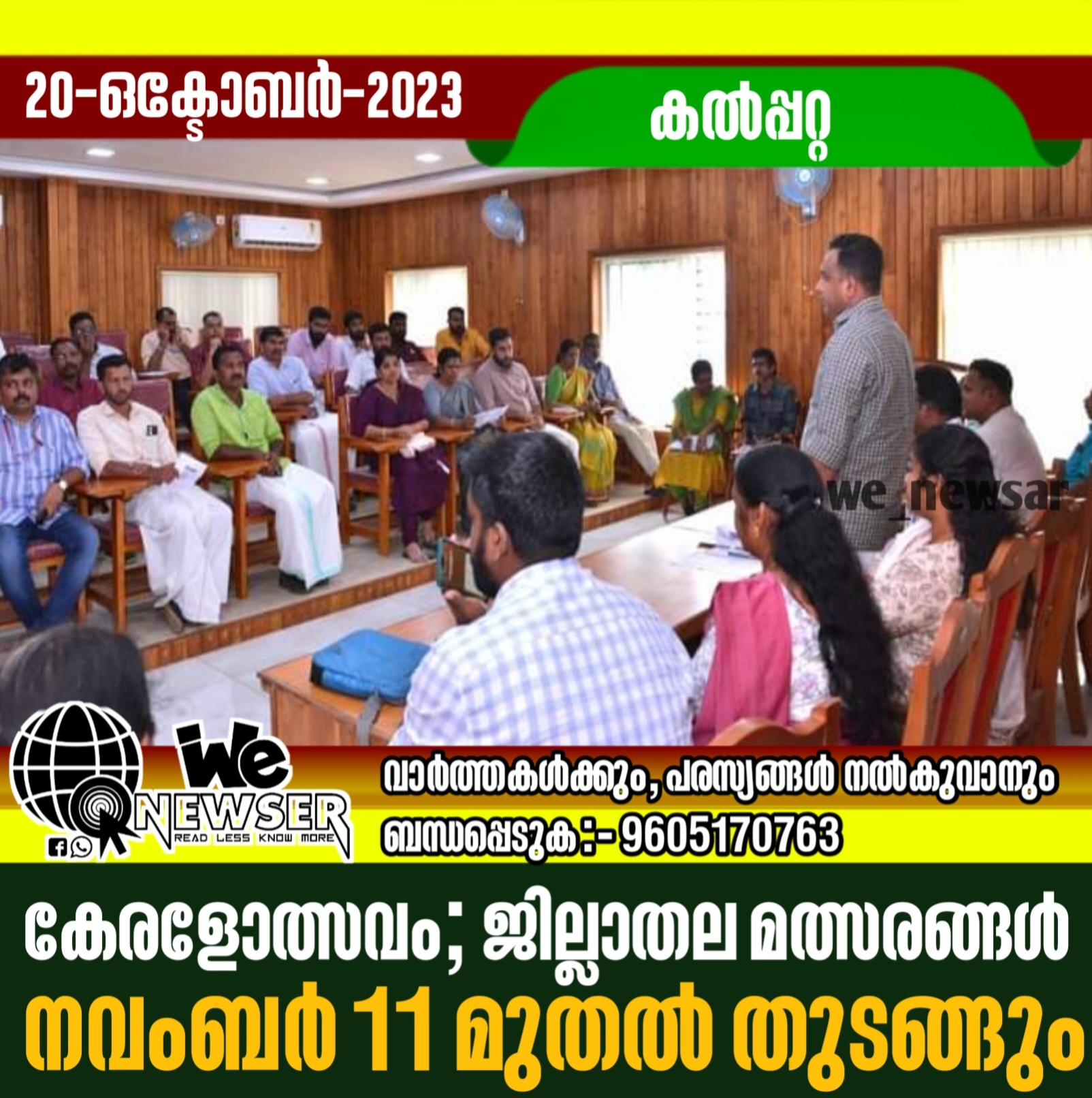 കലോത്സവങ്ങള് നവംബര് 11, 12 തീയ്യതികളില് വാരാമ്പറ്റ ഗവ. ഹൈസ്കുളിലും. കായിക മത്സരങ്ങള് നവംബര് 13 ന് കേണിച്ചിറ യുവ പ്രതിഭ സ്റ്റേഡിയത്തില് കബഡി, 14 ന് മുള്ളന്കൊല്ലി സെന്റ് മേരീസ് ഹയര് സെക്കന്ററി സ്കൂളില് ബാസ്കറ്റ് ബോള്, 15 ന് മുട്ടില് ഡബ്ല്യു.എം.ഒ. സ്കൂളില് ക്രിക്കറ്റ്, 16 ന് വെള്ളാരംകുന്ന് സ്മാഷ് സ്വിമ്മിംഗ് പൂളില് നീന്തല്, ചെന്നലോട് ഇന്റോര് സ്റ്റേഡിയത്തില് ബാഡ്മിന്റണ്, 17ന് പുല്പ്പള്ളിയില് അമ്പെയ്ത്, കളരി എന്നിവയും മൂലങ്കാവില് വോളിബോളും 18ന് ചെസ്, പഞ്ചഗുസ്തി, വടംവലി, അത്ലറ്റിക്സ് എന്നിവ മരവയല് ജില്ലാ സ്റ്റേഡിയത്തിലും നടക്കും.
