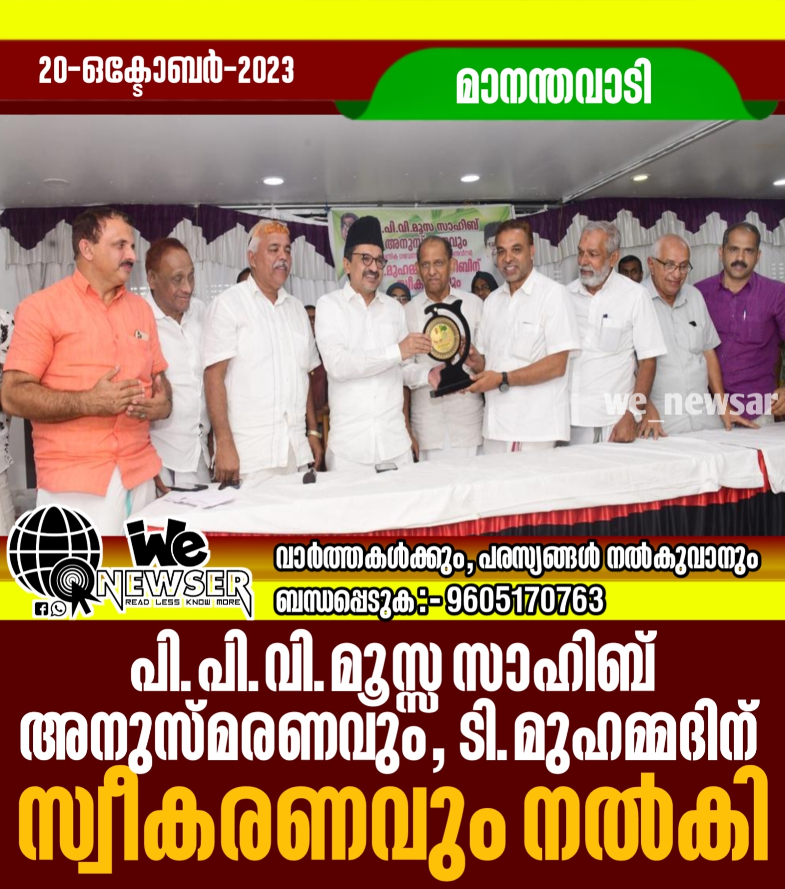 മാനന്തവാടി: മാനന്തവാടി നിയോജക മണ്ഡലം മുസ്ലിം ലീഗ് കമ്മിറ്റിയുടെ ആഭിമുഖ്യത്തിൽ മുസ്ലിം ലീഗ് ജില്ലാ നേതാവും മുൻ എം.എൽ.യു മായ പി.പി.വി.മൂസ്സ സാഹിബിന്റെ അനുസ്മരണവും,ചന്ദ്രിക ഗവേണിഗ് കൺവീനറായി തിരഞ്ഞെടുക്കപ്പെട്ട ടി.മുഹമ്മദിനുള്ള സ്വീകരണവും പാണക്കാട് സാദിക്കഅലി ശിഹാബ് തങ്ങൾ ഉൽഘാടനം ചെയ്തു. തന്റെ കുറഞ്ഞ ആയുസിനുള്ളിൽ നിന്ന് കൊണ്ട് ചെയ്യാൻ കഴിയുന്നതിൽ പതിന്മടങ്ങു സേവനം ചെയ്ത് തീർത്ത ഒരു നിസ്വാർത്ത നേതാവായിരുന്നു പി.പി.വി.മൂസ എന്ന് പാണക്കാട് സാദിക്കലി ശിഹാബ് തങ്ങൾ അനുസ്മരിച്ചു.ഒന്നും നേടാതെ,ഒരു കാലത്തു മാനന്തവാടിയിലെത്തുന്ന പാവപ്പെട്ടവരുടെ പ്രശ്നങ്ങൾ കേൾക്കാനും,അതിനു പരിഹാരം കാണാനും ആണ് മൂസ്സ സാഹിബിന്റെ ജീവിതം മുഴുവൻ നീക്കി വെച്ചതെന്നും തങ്ങൾ പറഞ്ഞു
