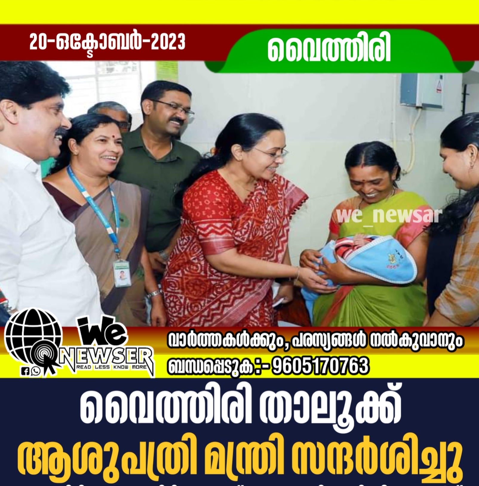 വൈത്തിരി : വൈത്തിരി താലൂക്ക് ആശുപത്രി മന്ത്രി വീണ ജോർജ് സന്ദര്ശിച്ചു. അഡ്വ. ടി സിദ്ധീഖ് എം.എല്.എ, കല്പ്പറ്റ ബ്ലോക്ക് പഞ്ചായത്ത് പ്രസിഡന്റ് ചന്ദ്രിക കൃഷ്ണന്, ബ്ലോക്ക് പഞ്ചായത്ത് മെമ്പര്മാരായ എല്സി ജോര്ജ്, ഉഷാകുമാരി, വൈത്തിരി ഗ്രാമ പഞ്ചായത്ത് പ്രസിഡന്റ് എം.വി വിജേഷ്, വൈസ് പ്രസിഡന്റ് ഉഷാ ജ്യോതി ദാസ്, കേരളാ ബാങ്ക് ഡയറക്ടര് പി. ഗഗാറിന്, ആരോഗ്യ വകുപ്പ് ഡയറക്ടര് ഡോ. കെ.ജെ റീന, ആരോഗ്യ വകുപ്പ് അഡീഷണല് ഡയറക്ടര് ഡോ. കെ.സക്കീന, ജില്ലാ മെഡിക്കല് ഓഫീസര് (ആരോഗ്യം) ഡോ.പി. ദിനീഷ്, ആര്ദ്രം നോഡല് ഓഫീസര് ഡോ.പി.എസ്. സുഷമ, ഡി.പി. എം ഡോ. സമീഹ സൈതലവി, വൈത്തിരി താലൂക്ക് ആശുപത്രി സുപ്രണ്ട് ഡോ.ഷെറിന് ജോസഫ്, ജില്ലാ മാസ്സ് മീഡിയ ആന്റ് എജ്യുക്കേഷന് ഓഫീസര് ഹംസ ഇസ്മാലി, ഡെപ്യൂട്ടി മാസ്സ് മീഡിയ ആന്റ് എജ്യുക്കേഷന് ഓഫീസര് കെ.എം മുസ്തഫ തുടങ്ങിയവര് മന്ത്രിയോടൊപ്പമുണ്ടായിരുന്നു.