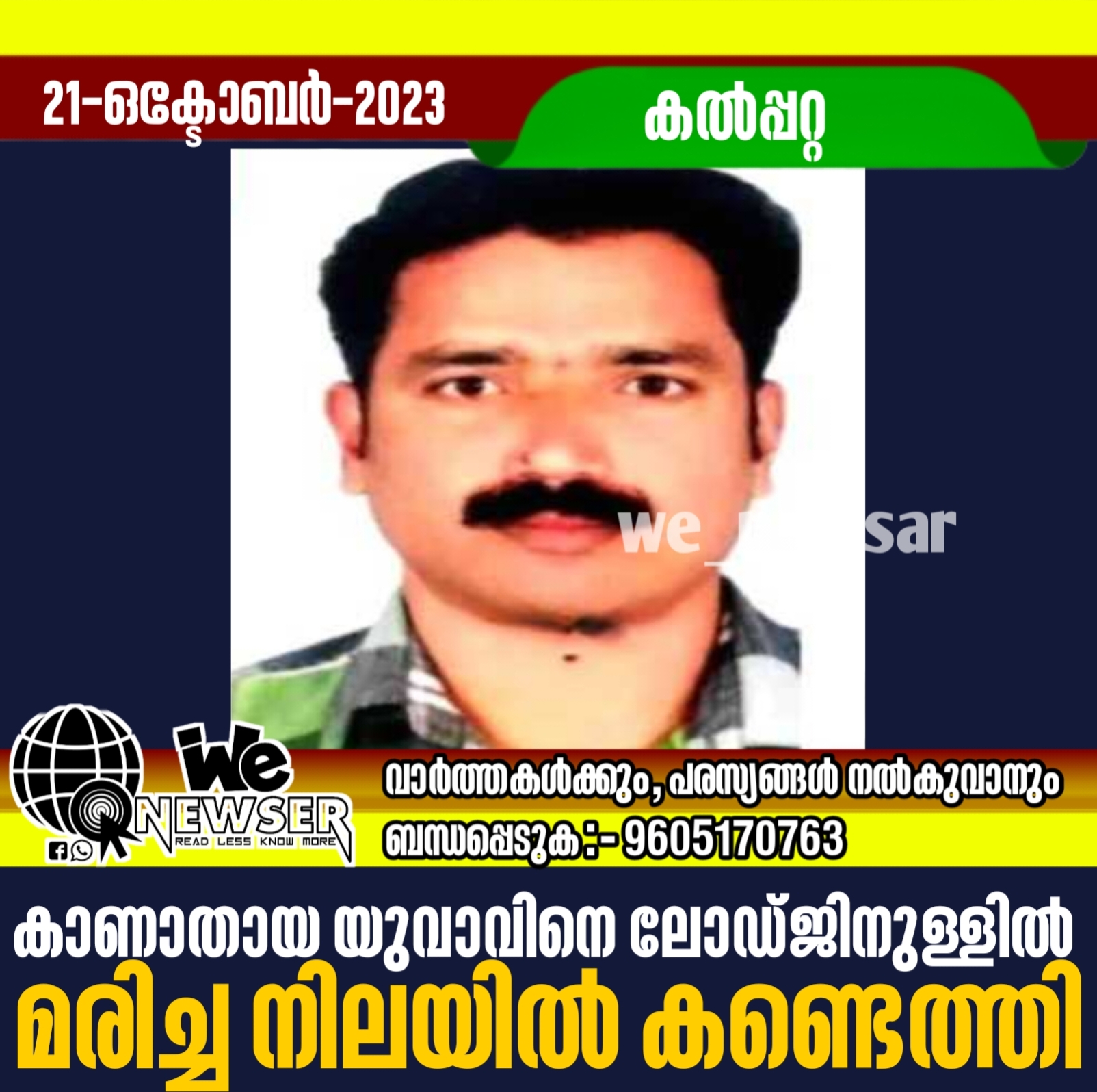 കല്‍പ്പറ്റ: മീനങ്ങാടി സ്വദേശിയായ യുവാവിനെ ലോഡ്ജിനുള്ളില്‍ മരിച്ച നിലയില്‍ കണ്ടെത്തി. മീനങ്ങാടി ചീരാംകുന്ന് താമരച്ചാലില്‍ ഷിജോ ആണ് മരിച്ച നിലയിൽ കണ്ടെത്തിയത്. യുവാവിനെ കഴിഞ്ഞ നാല് ദിവസം മുമ്പ് കാണാതായിരുന്നു. കഴിഞ്ഞ 17 മുതലാണ് ഷിജോയെ കാണാതായതെന്നും വ്യാഴാഴ്ച വരുമെന്ന് അറിയിച്ചിരുന്നതായും പിന്നീട് ഫോണ്‍ സ്വിച്ച് ഓഫ് ആയതായും വീട്ടുകാര്‍ പറഞ്ഞു. ഇതുമായി ബന്ധപ്പെട്ട് കഴിഞ്ഞ ദിവസം കുടുംബം മീനങ്ങാടി പോലീസ് സ്റ്റേഷനില്‍ പരാതിയും നല്‍കിയിരുന്നു. ഇതിനിടെയാണ് ഷിജോയെ കല്‍പ്പറ്റയിലെ സ്വകാര്യ ലോഡ്ജില്‍ മരിച്ച നിലയില്‍ കണ്ടതായ വിവരം ബന്ധുക്കള്‍ക്ക് ലഭിച്ചത്. വിഷം അകത്ത് ചെന്നാണ് മരണപ്പെട്ടതെന്നാണ് പ്രാഥമിക സൂചന. കല്‍പ്പറ്റ പോലീസ് സ്ഥലത്തെത്തി തുടര്‍ നടപടികള്‍ സ്വീകരിക്കുന്നു.