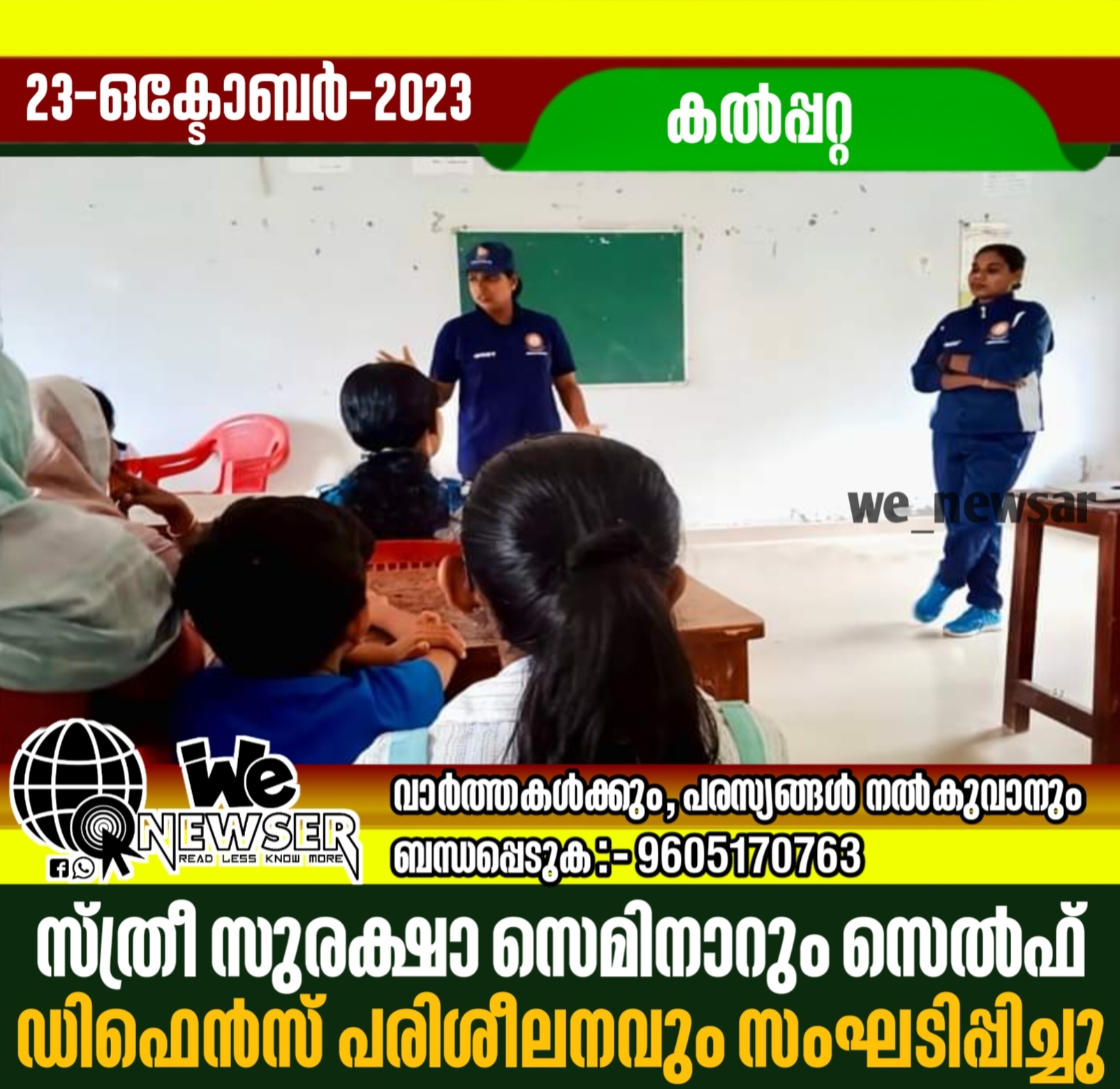 കൽപ്പറ്റ: വയനാട് ജില്ലാ ജനമൈത്രി പോലീസിന്റെയും റാട്ടക്കൊല്ലി പിജെ ജോയി സ്മാരക ഗ്രന്ഥശാലയുടെയും ലക്ഷ്യ സ്വാശ്രയസംഘത്തിന്റെയും സംയുക്താഭിമുഖ്യത്തിൽ സ്ത്രീ സുരക്ഷാ സെമിനാറും സെൽഫ്‌ ഡിഫെൻസ് പരിശീലന ക്ലാസും സംഘടിപ്പിച്ചു. ജില്ലാ ജനമൈത്രി പോലീസ് അസിസ്റ്റന്റ്‌ നോഡൽ ഓഫീസർ കെ.എം ശശിധരൻ പരിശീലന പരിപാടിയുടെ ഉദ്ഘാടനം നിർവ്വഹിച്ചു. പോലീസ് സെൽഫ്‌ ഡിഫൻസ്‌ ടീമംഗങ്ങളായ ഫൗസിയ, രേഷ്മ എന്നിവർ പരിശീലനത്തിന് നേതൃത്വം നൽകി. ശ്രീമതി അമ്പിളി അധ്യക്ഷത വഹിച്ച ചടങ്ങിൽ ശ്രീ. കെ. എ അഷ്ഫീർ സ്വാഗതവും ശ്രീമതി. സുജ ഇ.ബി നന്ദിയും പറഞ്ഞു.