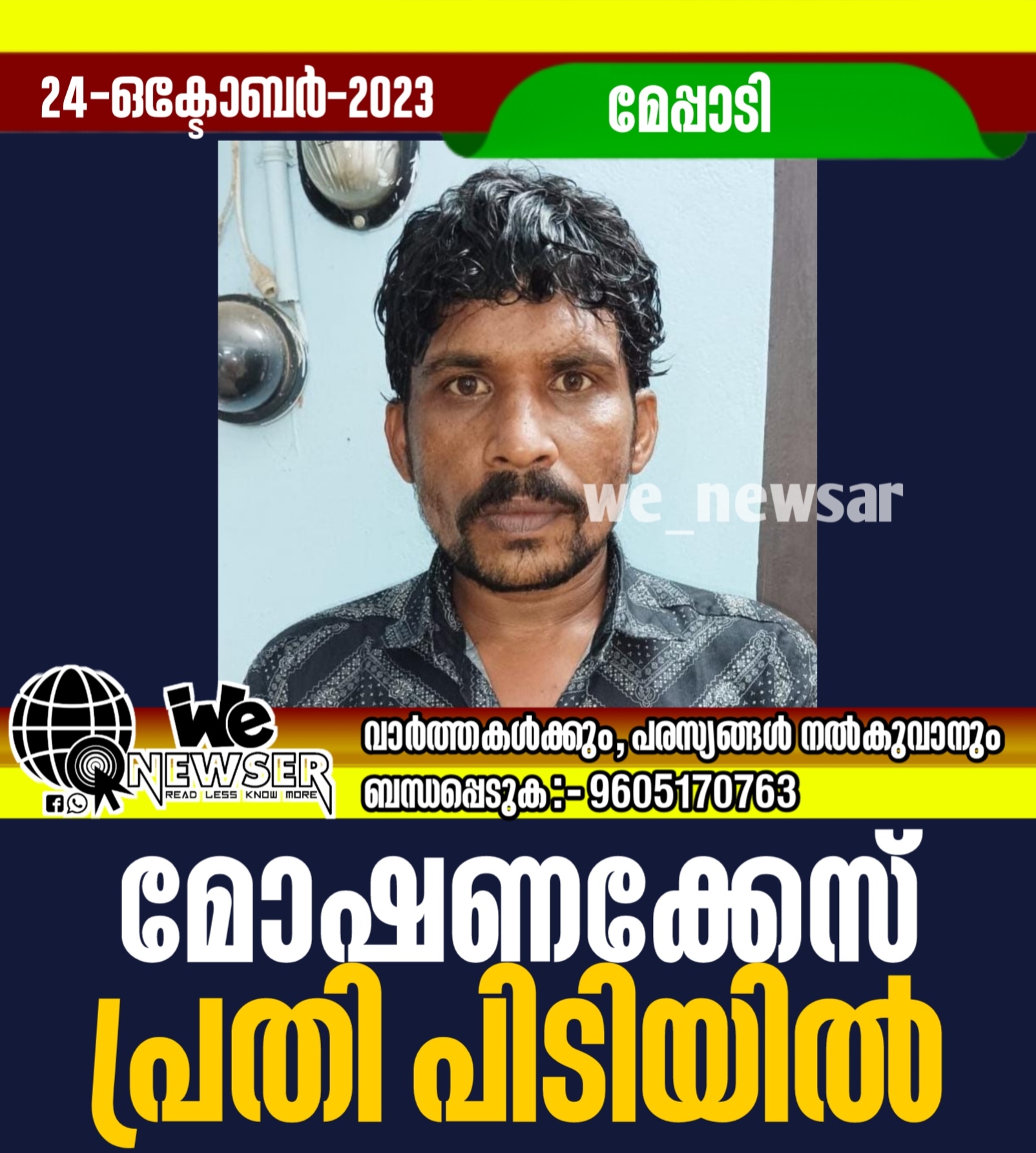 മേപ്പാടി : ടൗണിലെ സിറ്റി കമ്മ്യൂണിക്കേഷൻ സി.എസ്.സി സെന്റർ ജൂലൈ 26ന് രാത്രി കുത്തി തുറന്ന് പണവും കംപ്യൂട്ടർ സാമഗ്രികളും കവർച്ച നടത്തിയയാൾ പിടിയിൽ. മലപ്പുറം ജില്ലയിലെ തിരുനാവായ കൊടക്കൽ സ്വദേശിയും മേപ്പാടിയിൽ താമസക്കാരനുമായ പറമ്പിൽ സാജിത്ത് എന്ന താജുദ്ദീൻ ആണ് പിടിയിലായത്. മോഷണത്തിന് ശേഷം പ്രതി 3 മാസത്തോളമായി കേരളത്തിലും തമിഴ്നാട്ടിലുമായി ഒളിവിൽ താമസിച്ചു വരികയായിരുന്നു. കേരളത്തിലെ വിവിധ പൊലീസ് സ്റ്റേഷനുകളിലും റെയിൽവേ പൊലീസിലും മോഷണം കഞ്ചാവ് വിൽപന തുടങ്ങിയ വിവിധ കേസുകളിൽ പ്രതിയാണ്. ഇന്നലെ രാത്രി 8.15ന് പട്ടാമ്പിയിൽ വച്ചാണ് മേപ്പാടി പൊലീസ് പ്രതിയെ കസ്റ്റഡിയിലെടുത്തത്. മേപ്പാടി സ്റ്റേഷൻ ഇൻസ്പെക്ടർ എസ് എച്ച്.ഒ.എ. ബി. വിബിന്റെ നേതൃത്വത്തിൽ എസ്.ഐമാരായ സിറാജ് വി.പി, രജിത്ത് പി, സീനിയർ സിവിൽ പൊലീസ് ഓഫിസർ ബിഗേഷ്, സിവിൽ പൊലീസ് ഓഫിസർമാരായ റഷീദ്, നവീൻ എന്നിവരുടെ നേതൃത്വത്തിലാണ് പ്രതിയെ കസ്റ്റഡിയിലെടുത്തത്. പ്രതിയെ തെളിവെടുപ്പിന് ശേഷം കോടതിയിൽ ഹാജരാക്കി.