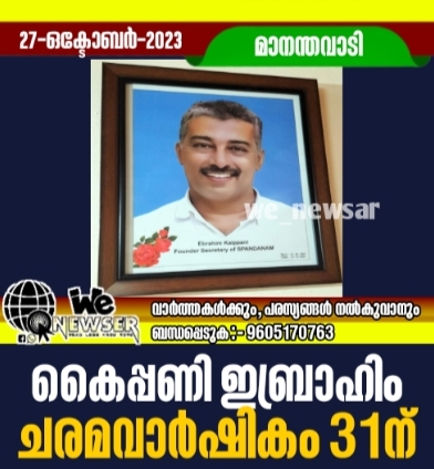 മാനന്തവാടി: വയനാട്ടിലെ സാമൂഹ്യ സാംസ്കാരിക ജീവകാരുണ്യ രംഗങ്ങളിലെ നിറസാന്നിധ്യവും സ്പന്ദനം സ്ഥാപക സാരഥിയുമായ കൈപ്പണി ഇബ്രാഹിമിന്റെ രണ്ടാം ചരമവാർഷികം 31ന് നടക്കും. സ്പന്ദനം മാനന്തവാടിയുടെ നേതൃത്വത്തിൽ നെല്ലൂർനാട് അംബേദ്കർ ആശുപത്രിയിൽ നടക്കുന്ന ചടങ്ങിൽ ബ്ലോക്ക് പഞ്ചായത്ത് പ്രസിഡൻറ് ജസ്റ്റിൻ ബേബി, എടവക പഞ്ചായത്ത് പ്രസിഡൻറ് എച്ച്.ബി. പ്രദീപ്, ജില്ലാ പഞ്ചായത്ത് സ്ഥിരം സമിതി അധ്യക്ഷൻ ജുനൈദ് കൈപ്പാണി, തുടങ്ങിയ ജനപ്രതിനിധികളും പ്രമുഖ വ്യക്തികളും പങ്കെടുക്കും. അനുസ്മരണ ചടങ്ങുകളുടെ ഭാഗമായി ആശുപത്രിയിലേക്ക് സ്പന്ദനം ഫർണിച്ചറുകളും ടോക്കൺ മെഷീനുകളും കൈമാറും.