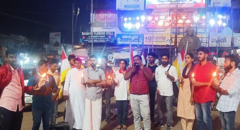 മാനന്തവാടി: ബത്തേരി വാകേരി മൂടക്കൊല്ലിയിൽ കടുവയുടെ ആക്രമണത്തിൽ യുവാവ് ദാരുണമായി കൊല്ലപ്പെട്ടത്തിൽ പ്രതിഷേധിച്ച് കെ.സി.വൈ.എം മാനന്തവാടി രൂപതയുടെ നേതൃത്വത്തിൽ മാനന്തവാടി ടൗണിൽ പന്തംകൊളുത്തി പ്രകടനം നടത്തി. പശുവിന് പുല്ലരിയാൻ പോയ മരോട്ടി പറമ്പിൽ പ്രജീഷ് (36) ആണ് കടുവയുടെ ആക്രമണത്തിന് ഇരയായി കൊല്ലപ്പെട്ടത്. വർധിച്ചു വരുന്ന വന്യമൃഗ ആക്രമണങ്ങളിൽ മനുഷ്യർ നിരന്തരം ദാരുണമായി കൊല്ലപ്പെടുന്നതിൽ പ്രതിഷേധിച്ചാണ് പന്തം കൊളുത്തി പ്രതിഷേധം നടത്തിയത്. മാനന്തവാടി ഗാന്ധി പാർക്കിൽ കെ.സി.വൈ.എം മാനന്തവാടി രൂപത പ്രസിഡന്റ് ജസ്റ്റിൻ ലൂക്കോസ് നിലംപറമ്പിൽ പ്രസംഗിച്ചു. വൈസ് പ്രസിഡന്റ് മെലിൻ ആന്റണി പുളിക്കയിൽ, ജനറൽ സെക്രട്ടറി അഭിനന്ദ് ജോർജ് കൊച്ചുമലയിൽ, സെക്രട്ടറി റ്റിജിൻ ജോസഫ് വെള്ളപ്ലാക്കിൽ, ട്രഷറർ ബിബിൻ പിലാപ്പിള്ളിയിൽ, കോ ഓർഡിനേറ്റർ അഖിൽ ജോസ് വാഴച്ചാലിൽ, ഡയറക്ടർ ഫാ.സാന്റോ അമ്പലത്തറ, ആനിമേറ്റർ സി.ബെൻസി ജോസ് എസ്. എച്ച്, കെ.സി.വൈ.എം മാനന്തവാടി രൂപത സംസ്ഥാന സെനറ്റ് അംഗം റ്റിബിൻ പാറക്കൽ, സിൻഡിക്കേറ്റ് അംഗമായ ക്ലിന്റ് ചായംപുന്നക്കൽ, ദ്വാരക മേഖല പ്രസിഡന്റ് അജയ് മുണ്ടയ്ക്കൽ, മെൽബിൻ കല്ലടയിൽ എന്നിവർ നേത്യത്വം നൽകി.