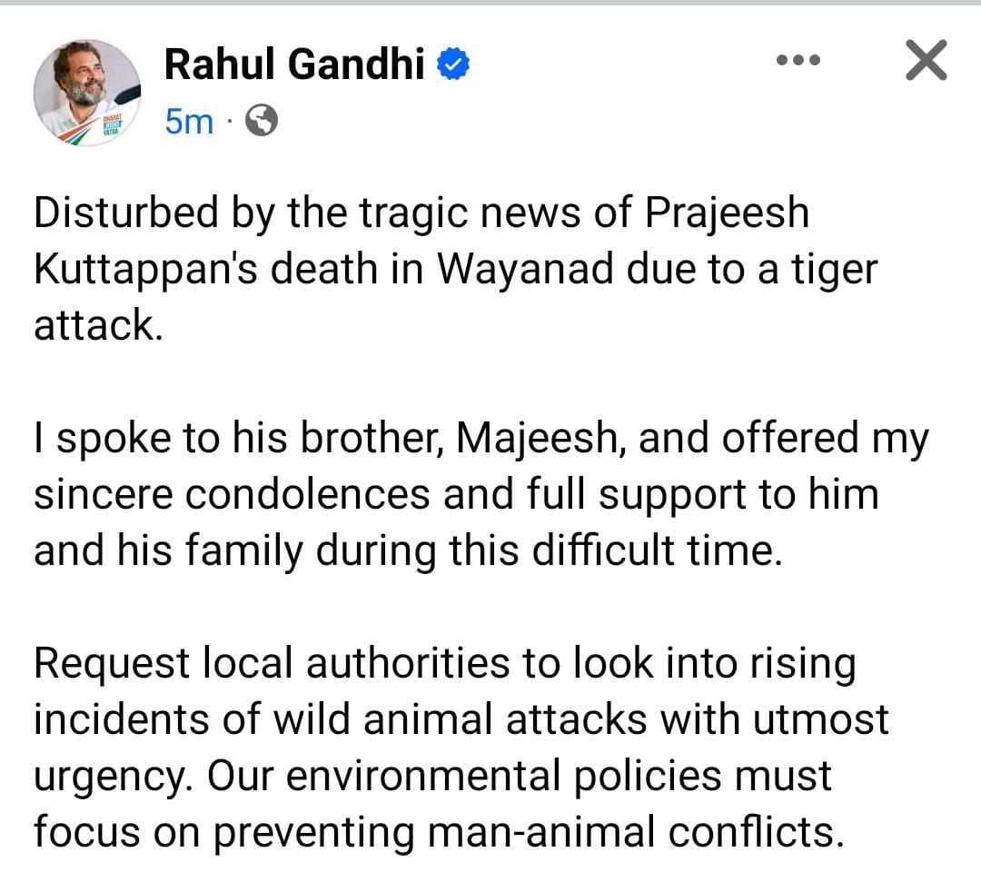 കല്‍പ്പറ്റ: കടുവയുടെ ആക്രമണത്തില്‍ കൊല്ലപ്പെട്ട വാകേരി കൂടല്ലൂരില്‍ ക്ഷീരകര്‍ഷകനായ പ്രജീഷിന്റെ കുടുംബാംഗങ്ങളെ ഫോണില്‍ വിളിച്ച് ആശ്വാസിപ്പിച്ച് രാഹുല്‍ഗാന്ധി എം പി. തിങ്കളാഴ്ച വൈകിട്ടോടെയാണ് രാഹുല്‍ഗാന്ധി പ്രജീഷിന്റെ സഹോദരന്‍ മജീഷിനെ ഫോണില്‍ വിളിച്ച് ആശ്വാസിപ്പിച്ചത്. എല്ലാവിധ സഹായങ്ങളുമായി ഒപ്പമുണ്ടാകുമെന്ന് പറഞ്ഞ രാഹുല്‍ഗാന്ധി കുടുംബാംഗങ്ങളുടെ ദുഖത്തില്‍ പങ്കുചേര്‍ന്നു.