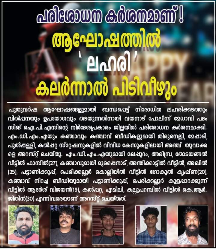 പരിശോധന കര്ശനമാണ് ആഘോഷത്തില് ‘ലഹരി’ കലര്ന്നാല് പിടിവീഴും വിവിധ കേസുകളിലായി അഞ്ച് യുവാക്കളെ അറസ്റ്റ് ചെയ്തു.