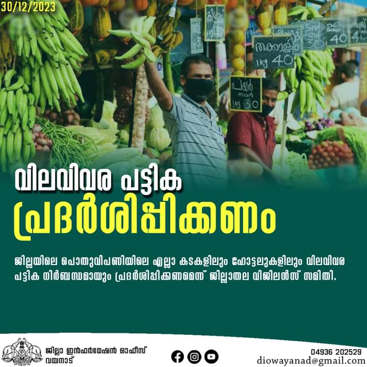 കല്പറ്റ: ജില്ലയിലെ പൊതുവിപണിയിലെ എല്ലാ കടകളിലും ഹോട്ടലുകളിലും വിലവിവര പട്ടിക നിര്ബന്ധമായും പ്രദര്ശിപ്പിക്കണമെന്ന് ജില്ലാതല വിജിലന്സ് സമിതി. എ.ഡി.എം എന്.ഐ ഷാജുവിന്റെ അധ്യക്ഷതയില് കലക്ടറേറ്റില് ചേര്ന്ന വിജിലന്സ് സമിതി യോഗത്തിലാണ് തീരുമാനം. വിലവിവര പട്ടിക നിര്ബന്ധമായുംപ്രദര്ശിപ്പിക്കണമെന്നും രണ്ട് തവണയില് കൂടുതല് നോട്ടീസ് നല്കിയിട്ടും വിലവിവര പട്ടിക പ്രദര്ശിപ്പിക്കാത്ത കടകള്ക്കെതിരെ നിയമ നടപടികള് സ്വീകരിക്കുമെന്നും എ.ഡി.എം അറിയിച്ചു.