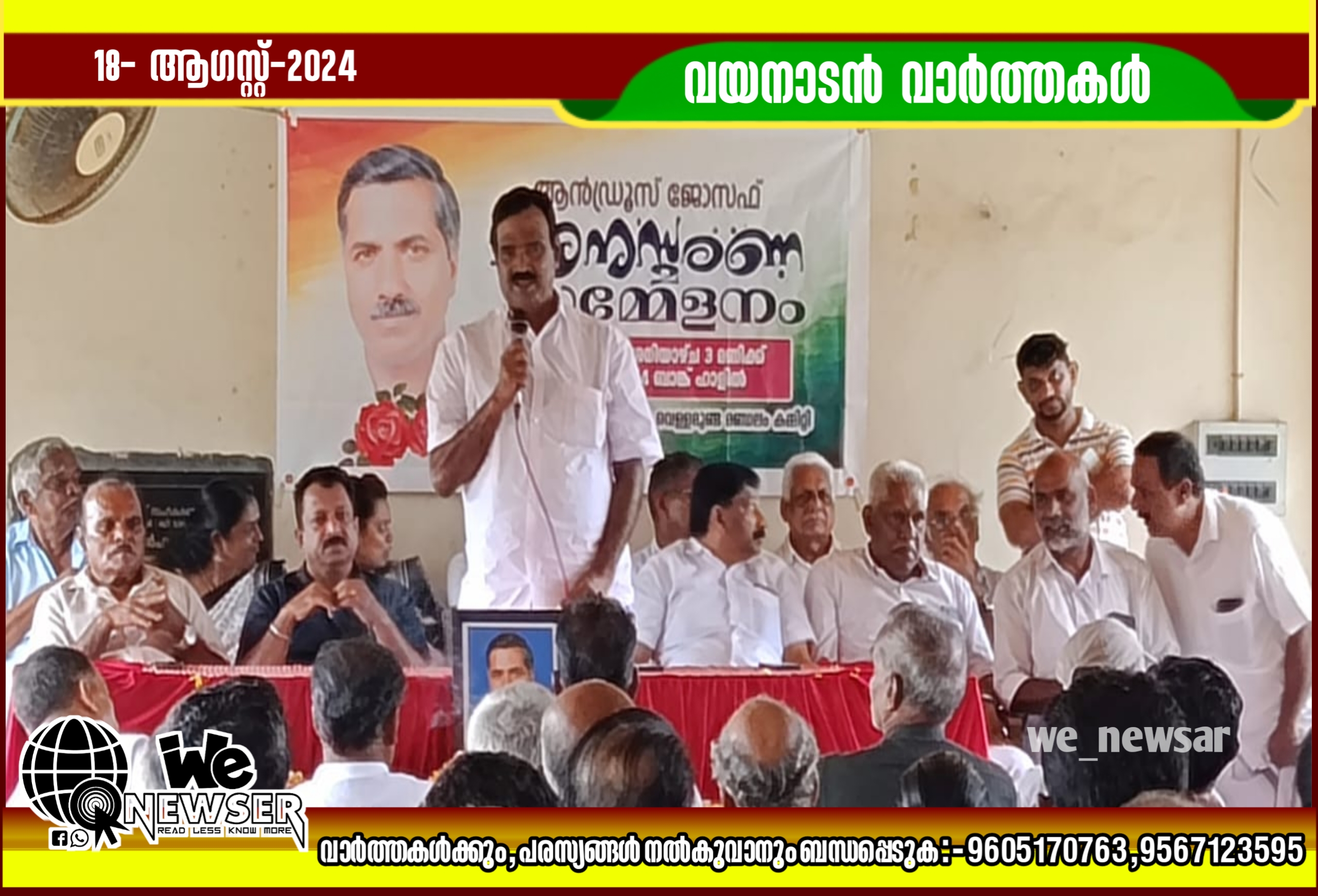 വെള്ളമുണ്ട: കോൺഗ്രസ് മുൻ മണ്ഡലം പ്രസിഡന്റും മുൻ പഞ്ചായത്ത് വൈസ്പ്രസിഡന്റുമായിരുന്ന ആൻഡ്റൂസ് ജോസഫന്റെ ഒന്നാം ചരമദിനമായ ഓഗസ്റ്റ് 17ന് കർഷക കോൺഗ്രസ് വെള്ളമുണ്ട മണ്ഡലം കമ്മറ്റി വെള്ളമുണ്ട ബാങ്ക് ഹാളിൽ വെച്ച് അനുസ്മരണ സമ്മേളനം നടത്തി. പ്രസിഡന്റ് മനോജ് TB അധ്യക്ഷത വഹിച്ചു. കെപിസിസി എക്സിക്യൂട്ടീവ് മെമ്പർ K.L. പൗലോസ് ഉത്ഘാടനം ചെയ്തു. മാതൃക നേതാവായിരുന്നു ആൻഡ്റൂസ് ജോസഫ് എന്ന് KL പൗലോസ് പറഞ്ഞു.സാധാരണക്കാരോടും ആദിവാസികളോടും ചേർന്ന് പ്രവർത്തിച്ചു ജനകീയനായ നേതാവായിതീർന്ന ആൻഡ്റൂസ് ജോസഫ് ന്റെ മാതൃകയിൽ നാം മുന്നോട്ട് പോകണമെന്നും ഉത്ഘാടന പ്രസംഗത്തിൽ, K L പൗലോസ് പറഞ്ഞു. ജനപങ്കാളിത്തം കൊണ്ട് ഏറെ ഏറെ ശ്രദ്ധേയമായിരുന്നു അനുസ്മരണ സമ്മേളനം.ബ്ലോക്ക് കോൺഗ്രസ് പ്രസിഡന്റ്, ജിത്സൻ തൂപ്പുങ്കര, സി. അബ്ദുൽ അഷ്റഫ്, P. ചന്ദ്രൻ, PM, ബെന്നി, വി വി. നാരായണവാര്യർ, അസീസ് വാളാട്, അജ്മൽ, വി.വി. ബാലൻ, ജിജി പോൾ, വിനോദ് പാലയണ, P. K. മൊയ്ദു, ദേവി രാമചന്ദ്രൻ,പഞ്ചായത്ത് മെമ്പർമാരായ ഷൈജി ഷിബു, ലതിക, വട്ടമാറ്റം വർഗീസ്,നിസാർ.അന്ത്രു മണിമ, ഷാജി, പൗലോസ്. M A,വിജയൻ വെള്ളമുണ്ട. ഇബ്രായി മുരിങ്ങക്കൽ, നിസാം, ജിജോ,ശ്രീധരൻ നായർ,എന്നിവർ പ്രസംഗിച്ചു.സ്റ്റീഫൻ,ബഷീർ തോട്ടോളി,രാമകൃഷ്ണൻ, ഗോപി കളത്തിൽ, സിറാജ്, മുത്തലിബ്, റെജിപുന്നോലിൽ, ബാബു കൊമ്മയാട് , നാസർ, സുരേഷ്, മുത്തലിബ്,അഷ്റഫ് കരിങ്ങാരി, ഷംസീർ, ശിഹാബ്,തുടങ്ങിയവർ നേതൃത്വം നൽകി.
