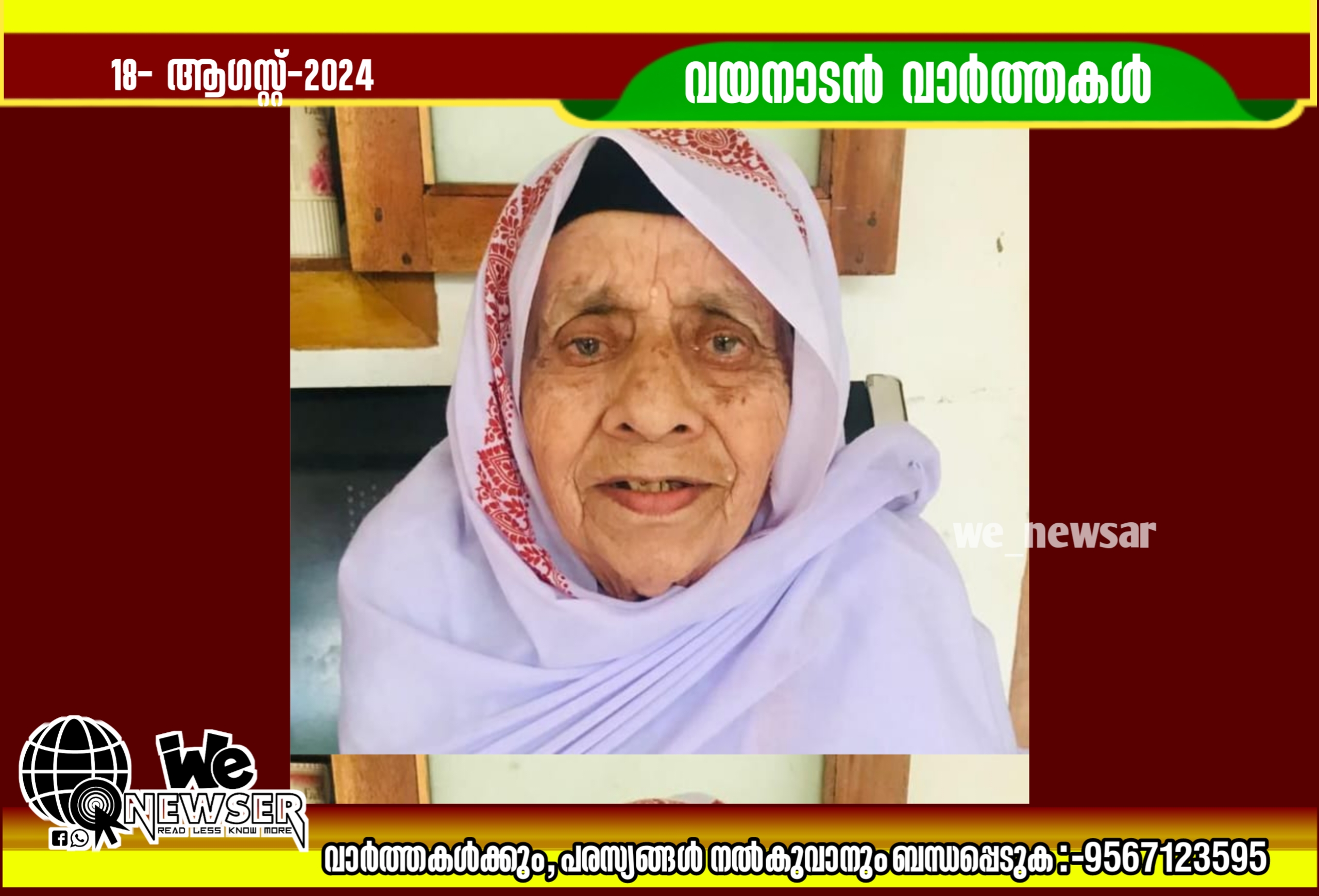 കണിയാമ്പറ്റ: മില്ല് മുക്ക് നെല്ലോളി കുഞ്ഞാമി (101) നിര്യാതയായി. മക്കൾ:അസീസ്(ബാപ്പു), സുഹറ, ജമീല,സൈനബ, ആയിഷ, മയ്യിത്ത് നിസ്കാരം ഇന്ന് ഉച്ചയ്ക്ക് 12:മണിക്ക് മില്ല്മുക്ക് ജുമാ മസ്ജിദിൽ.