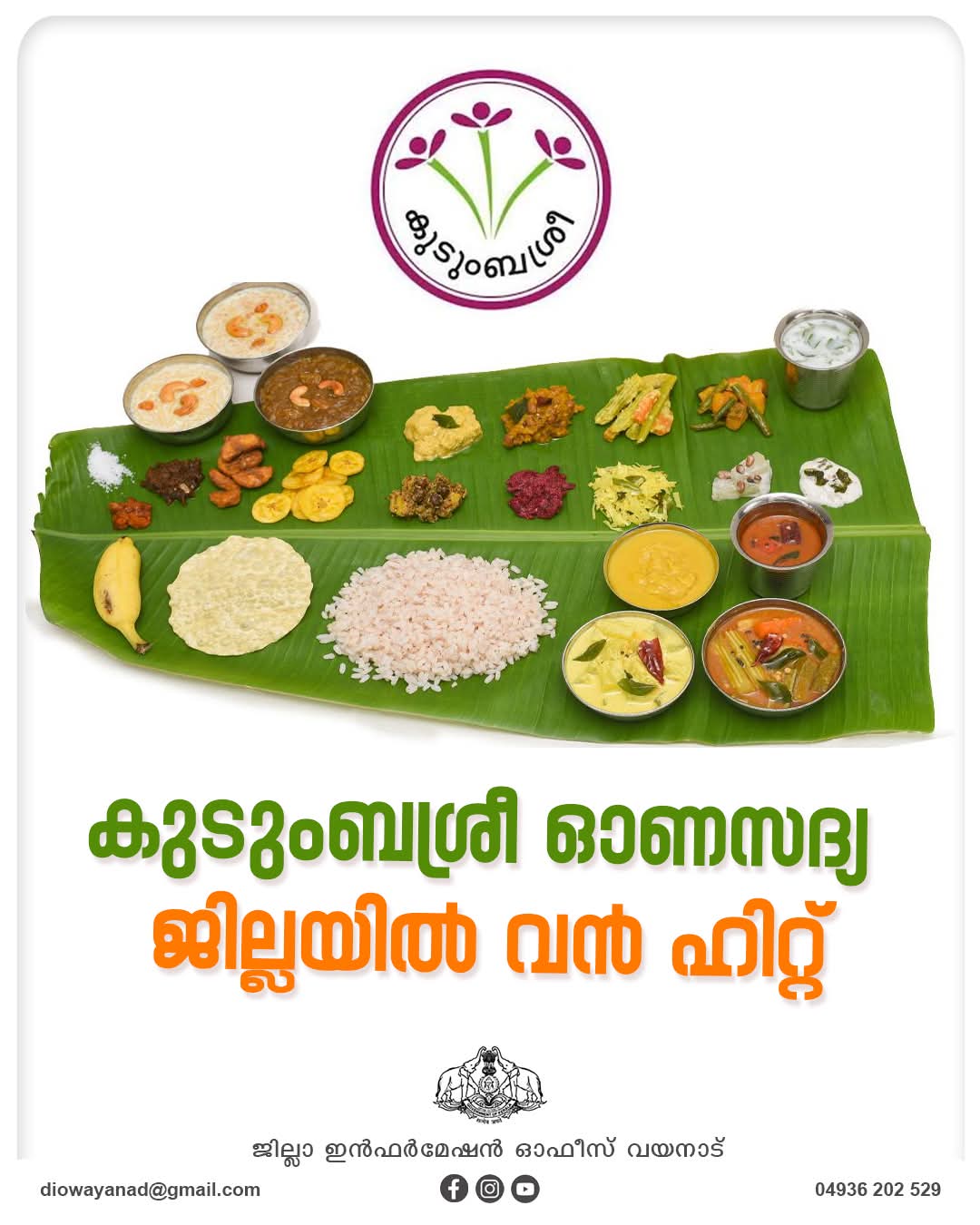 രണ്ട് തരത്തിലുള്ള പായസം, കാളൻ, ഓലൻ, അവിയൽ, പച്ചടി, തോരൻ, പുളിയിഞ്ചി, ചിപ്സ്, ശർക്കര ഉപ്പേരി തുടങ്ങി 28 വിഭവങ്ങളാണ് ഓണസദ്യയിൽ ഉൾപ്പെടുത്തിയിരിക്കുന്നത്. 28 വിഭവങ്ങൾ അടങ്ങിയ സദ്യയ്ക്ക് 300 രൂപയാണ് വില. കുടുംബശ്രീ അംഗങ്ങളുടെ മികവും കൈപ്പുണ്യവും ഒത്തിണങ്ങിയ വിഭവങ്ങൾ ആയതിനാൽ സാധാരണക്കാക്കിടയിൽ വമ്പൻ സ്വീകാര്യതയാണ്. വിഭവങ്ങളുടെ എണ്ണം അനുസരിച്ചു 180 രൂപ മുതൽ 300 രൂപ വരെയുള്ള നാല് തരം സദ്യകൾ തെരെഞ്ഞടുക്കാം.
