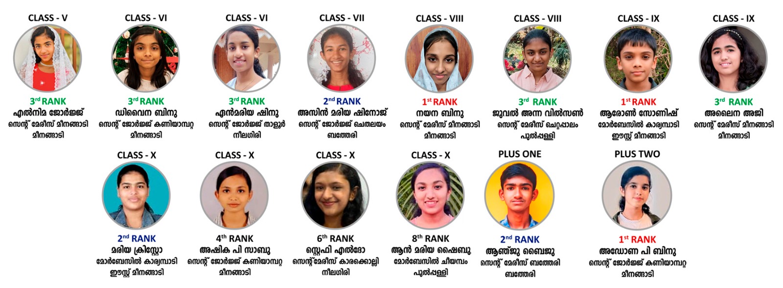 അഞ്ചാം ക്ലാസിൽ മീനങ്ങാടി സെൻ്റ് മേരീസിലെ എൽ നിമ ജോർജ് , ആറാം ക്ലാസിൽ കണിയാമ്പറ്റ സെൻ്റ് ജോർജിലെ ഡിവൈന വിനു , താളൂർ സെൻ്റ് ജോർജിലെ എൻ മരിയ ഷിനു എന്നിവർ മൂന്നാം റാങ്കുകൾ നേടി. ഏഴാം ക്ലാസിൽ ചെതലയം സെൻ്റ് ജോർജിലെ അസിൻ മരിയാ ഷിനോജ് 2-ാം റാങ്കും.8-ാം ക്ലാസിൽ മീനങ്ങാടി സെൻ്റ് മേരീസിലെ നയനാ ബിനു ഒന്നാം റാങ്കും, ചെറ്റപ്പാലം സെൻ്റ് മേരീസിലെ ജ്യുവൽ അന്ന വിൽസൺ മൂന്നാം റാങ്ക് നേടി.ഒമ്പതാം ക്ലാസിൽ കാര്യമ്പാടി മോർ ബേസിലിലെ ആരോൺ സോണിഷിന് ഒന്നാം റാങ്ക് ലഭിച്ചു. മീനങ്ങാടി സെൻ്റ് മേരീസിലെ അലൈന അജിക്കാണ് 3-ാം റാങ്ക് .പ്ലസ് വണ്ണിൽ ബത്തേരി സെൻ്റ് മേരീസിലെ അഞ്ചു ബൈജു 2-ാം റാങ്ക് നേടി. +2വിന് മലബാർ ഭദ്രാസനത്തിൽആദ്യമായി കണിയാമ്പറ്റ സെൻ്റ് ജോർജിലെ അഡോണ പി.ബിനു ഒന്നാം റാങ്ക് കരസ്ഥമാക്കി. JSSLC വാർഷിക പരീക്ഷയിൽ ഭദ്രാസനത്തിന് ആദ്യമായി 4 റാങ്കുകൾ ഒരു വർഷം ലഭിച്ചു എന്നത് പ്രതേകം അഭിനന്ദാനർഹമാണ്. കാര്യമ്പാടി മോർ ബേസിലിലെ മരിയാ ക്രിസ്റ്റോ രണ്ടാം റാങ്കും കണിയാമ്പറ്റ സെൻ്റ് ജോർജിലെ അഷിക പി.സാബു 4-ാം റാങ്കും കാരക്കൊല്ലി സെൻ്റ് മേരീസിലെ സ്റ്റെഫി എൽദോ 6 -ാം റാങ്കും ചീയമ്പം മോർ ബേസിലിലെ ആൻ മരിയ ഷൈബു മാർക്കോടെ 8-ാം റാങ്കും നേടി.