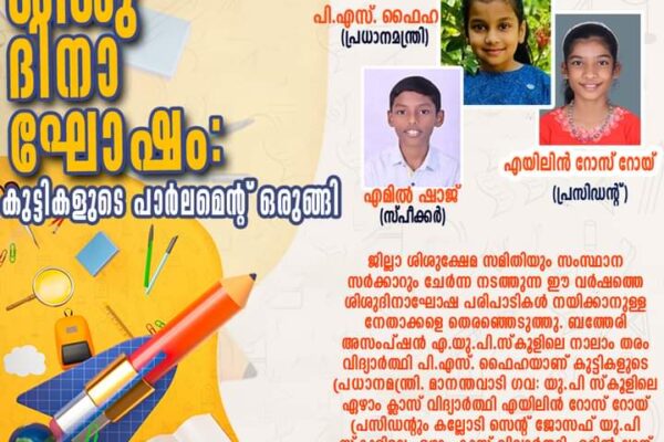 കൽപ്പറ്റ : ജില്ലാ ശിശുക്ഷേമ സമിതിയും സംസ്ഥാന സര്ക്കാറും ചേര്ന്ന നടത്തുന്ന ഈ വര്ഷത്തെ ശിശുദിനാഘോഷ പരിപാടികള് നയിക്കാനുള്ള നേതാക്കളെ തെരഞ്ഞെടുത്തു. ബത്തേരി അസംപ്ഷന് എ.യു.പി.സ്കൂളിലെ നാലാം തരം വിദ്യാര്ത്ഥി പി.എസ്. ഫൈഹയാണ് കുട്ടികളുടെ പ്രധാനമന്ത്രി. മാനന്തവാടി ഗവ: യു.പി സ്കൂളിലെ ഏഴാം ക്ലാസ് വിദ്യാര്ത്ഥി എയിലിന് റോസ് റോയ് പ്രസിഡന്റും കല്ലോടി സെന്റ് ജോസഫ് യു.പി സ്കൂളിലെ ഏഴാം ക്ലാസ് വിദ്യാര്ത്ഥി എമില്ഷാജ് സ്പീക്കറുമാകും. കല്പ്പറ്റ ഡിപോള് പബ്ലിക് സ്കൂളിലെ നാലാം ക്ലാസ് വിദ്യാര്ത്ഥി അച്വുത്…